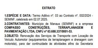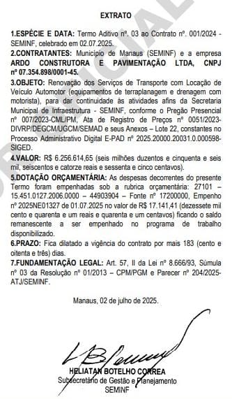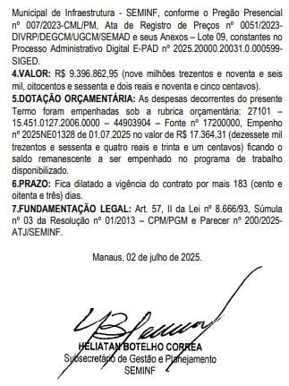 Essa é a terceira vez que a empresa tem o contrato prorrogado pela Prefeitura de Manaus. O extrato do termo aditivo ao contrato nº 004/2024 – Seminf foi assinado pelo subsecretário de Gestão e Planejamento da secretaria, Heliatan Botelho Corrêa, em 2 de julho.