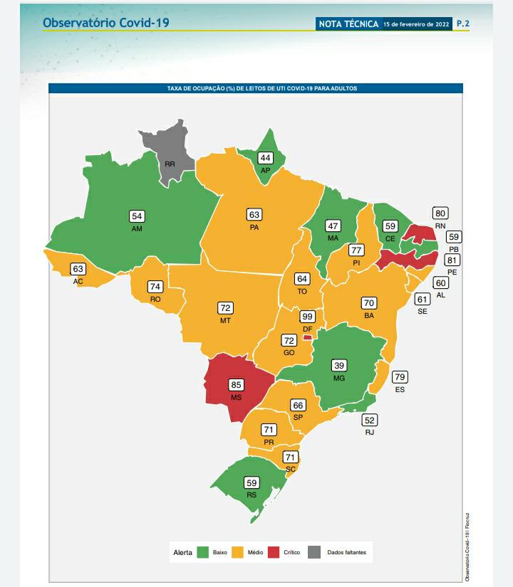 O Amazonas apresenta 54% dos leitos de UTI ocupados com pacientes com Covid-19. Os outros sete Estados, que também estão fora da zona de alerta, são: Amapá (44%), Maranhão (47%), Ceará (59%), Paraíba (59%), Minas Gerais (39%), Rio de Janeiro (52%) e Rio Grande do Sul (59%).