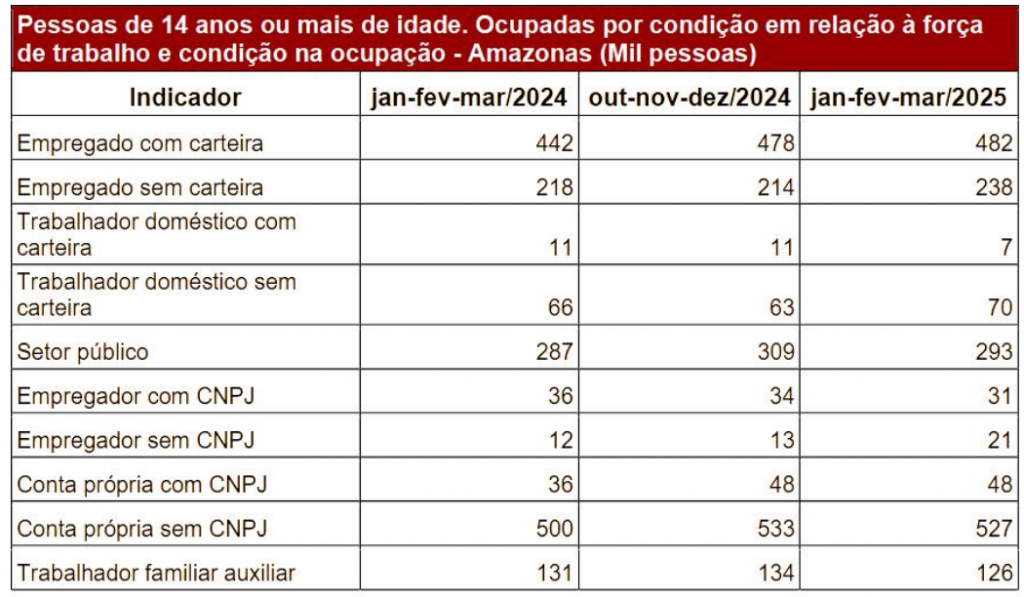 No Amazonas, o número de pessoas empregadas com carteira assinada aumentou ao longo do trimestre. De janeiro a março de 2024, o número era de 442 mil empregados com carteira assinada. No mesmo período de 2025, o número passou para 482 mil pessoas trabalhando de carteira assinada no Estado.
