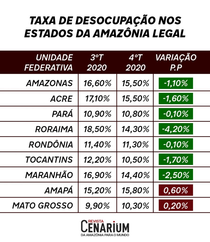 MANAUS – Amapá e Mato Grosso foram os únicos Estados da Amazônia Legal a registrar, respectivamente, um aumento de 0,6% e 0,2% em pontos percentuais (p. p.), no índice de desocupação do quarto e último trimestre de 2020, de acordo com dados divulgados nesta quarta-feira, 10, pelo Instituto Brasileiro de Geografia e Estatística (IBGE).