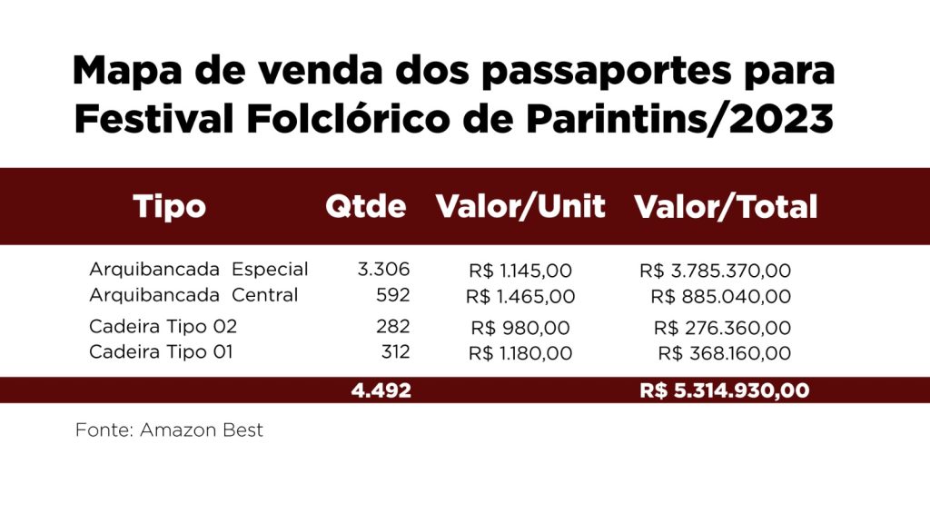 Já 312 passaportes para a “cadeira tipo 1” possuem o valor unitário de R$ 1.180 que, juntos, fazem R$ 368.160. Se todos os ingressos forem vendidos – como ocorre todo o ano – a Amazon Best fatura um total de R$ 5.314.930. A situação dos outros 15.508 lugares do Bumbódromo não foi explicada pela empresa nem pela Prefeitura de Parintins.