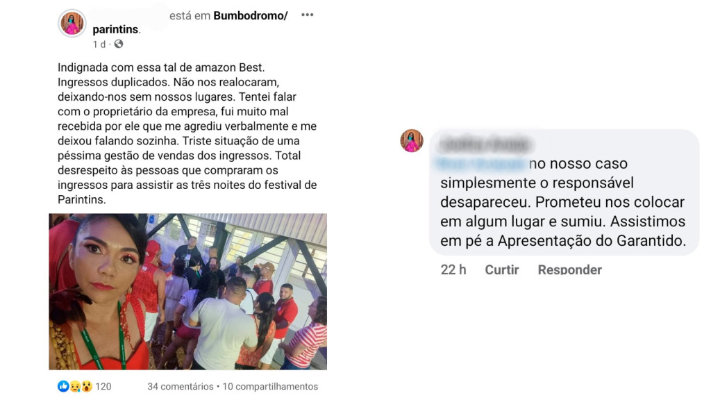 Em um comentário da postagem, a mulher ressalta ainda que, após tentar resolver o impasse junto à Amazon Best e aos responsáveis pela venda, não obteve êxito. Desse modo, mesmo após pagar por um assento, a torcedora do Garantido teve que assistir à apresentação, que tem duração de 2h30, em pé. “O responsável desapareceu. [Ele] prometeu nos colocar em algum lugar e sumiu. Assistimos em pé a apresentação do Garantido”, relatou.