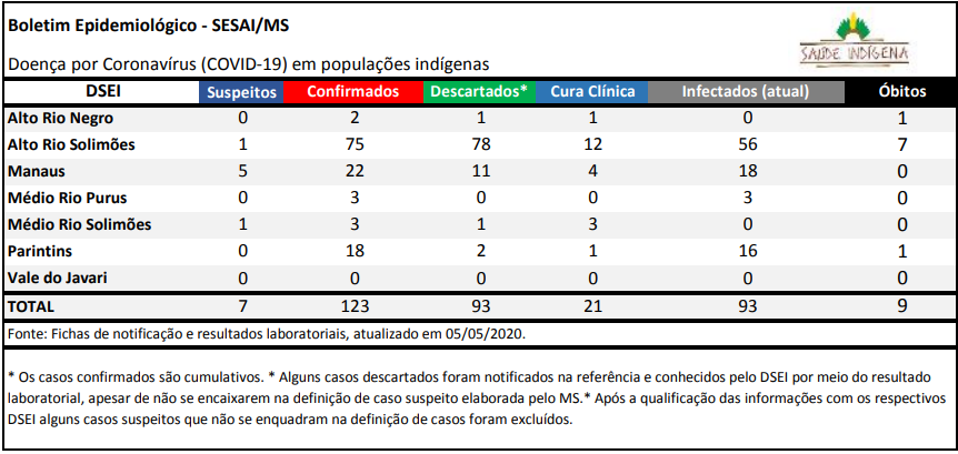 Na última atualização da Secretaria Especial de Saúde Indígena (Sesai), datada de ontem, consta que mais cinco indígenas estão contaminados. Ao todo, são 123 no Amazonas. Mais duas mortes também foram confirmadas, somando nove. O Alto Rio Solimões segue coma a região mais atingida, com 75 casos. As taxas já foram alarmadas por movimentos nacionais de estarem equivocadas, pela subnotificação.