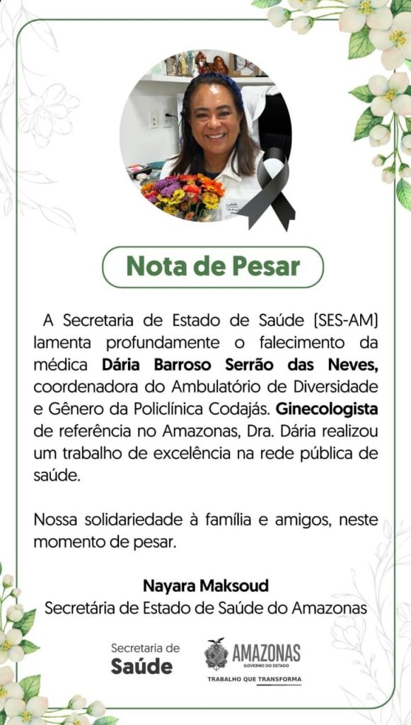 A Secretaria de Estado de Saúde do Amazonas (SES-AM) divulgou uma nota de pesar em homenagem à médica, enaltecendo o trabalho de Dária na rede pública estadual.