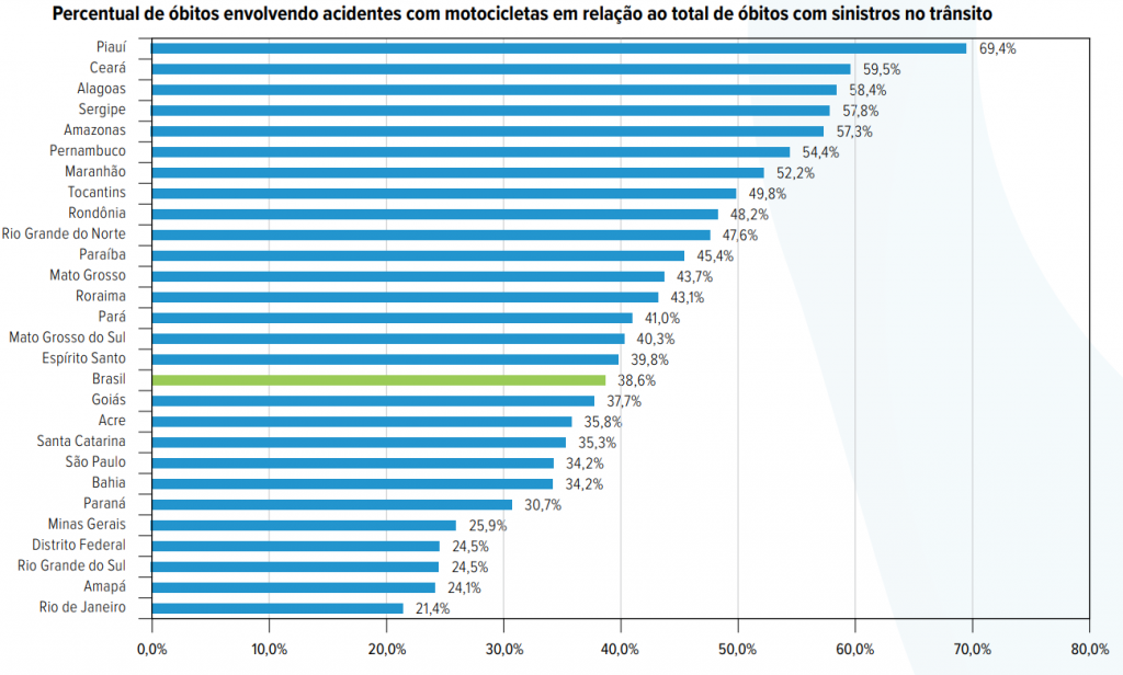 Quando comparado o número de óbitos em relação ao percentual total de mortes no trânsito, o Amazonas passa a ocupar o 5° lugar da lista das Unidades da Federação (UFs) com mais registros, sendo o único da Região Norte a estar entre os cinco primeiros colocados da lista. O número de óbitos envolvendo motocicletas corresponde a 57,3% do total de mortes em acidentes de trânsito no Estado. A porcentagem está acima da média nacional de 38,6%.