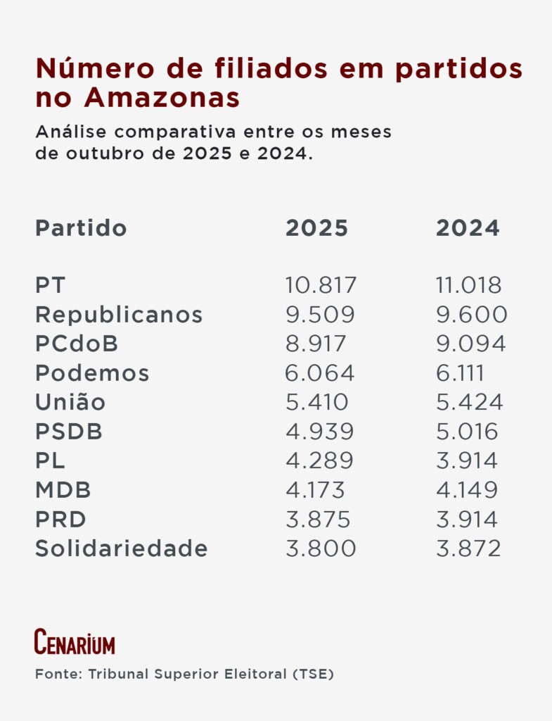 Na lista das legendas com maior presença no Amazonas, o PT é seguido por Republicanos (9.509 filiados), PCdoB (8.917), Podemos (6.064) e União Brasil (5.410). Todas apresentaram redução em relação ao ano passado. Entre as cinco primeiras colocadas, PT e PCdoB tiveram as quedas mais expressivas, com 201 e 177 filiados a menos, respectivamente.