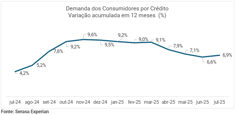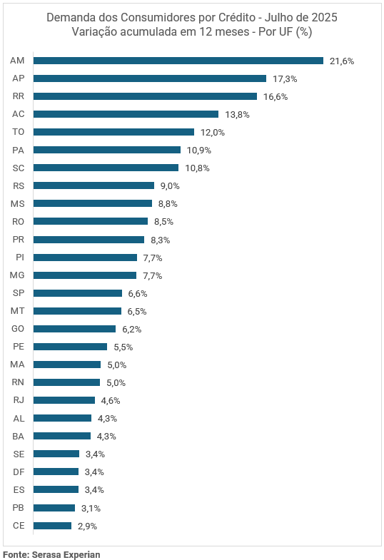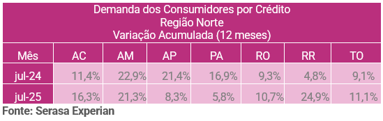 O Indicador de Demanda dos Consumidores por Crédito, da Serasa Experian, mostra quando há solicitação por crédito, sem diferenciar se o pedido é aceito ou não. Nacionalmente, a alta acumulada foi de 6,9%, bem abaixo do observado no Norte, região que puxou o crescimento brasileiro. Além de Amazonas e Roraima, o Amapá também se destacou com aumento de 17,3% na demanda.