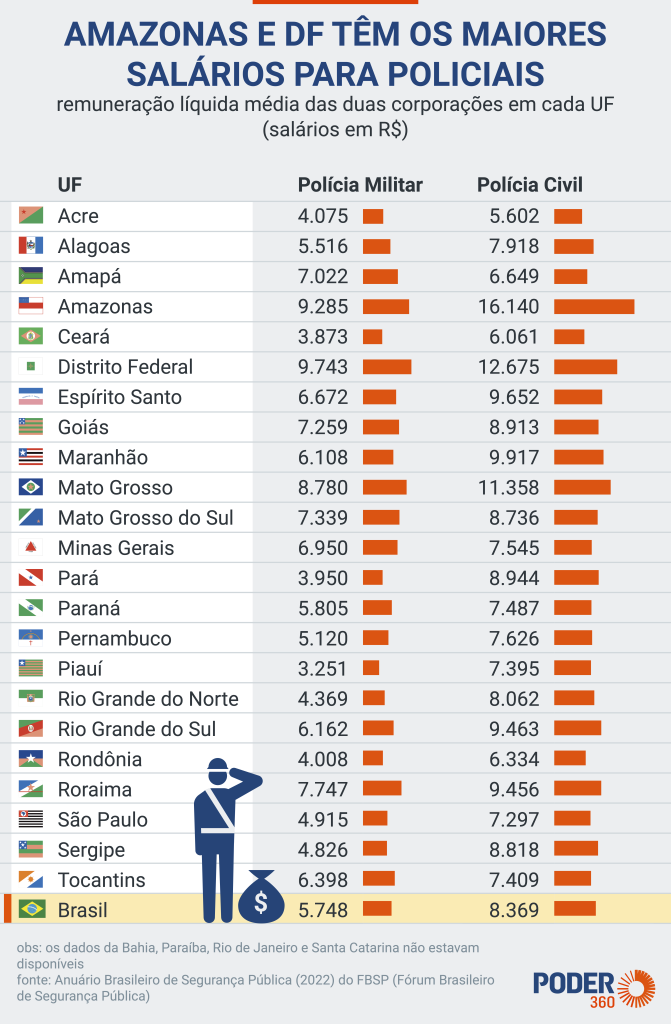 De acordo com o anuário, os PMs do Piauí têm o menor salário do Brasil, de R$ 3.251. O Acre, na Região Norte, tem a menor remuneração para policiais civis (R$ 5.602).
