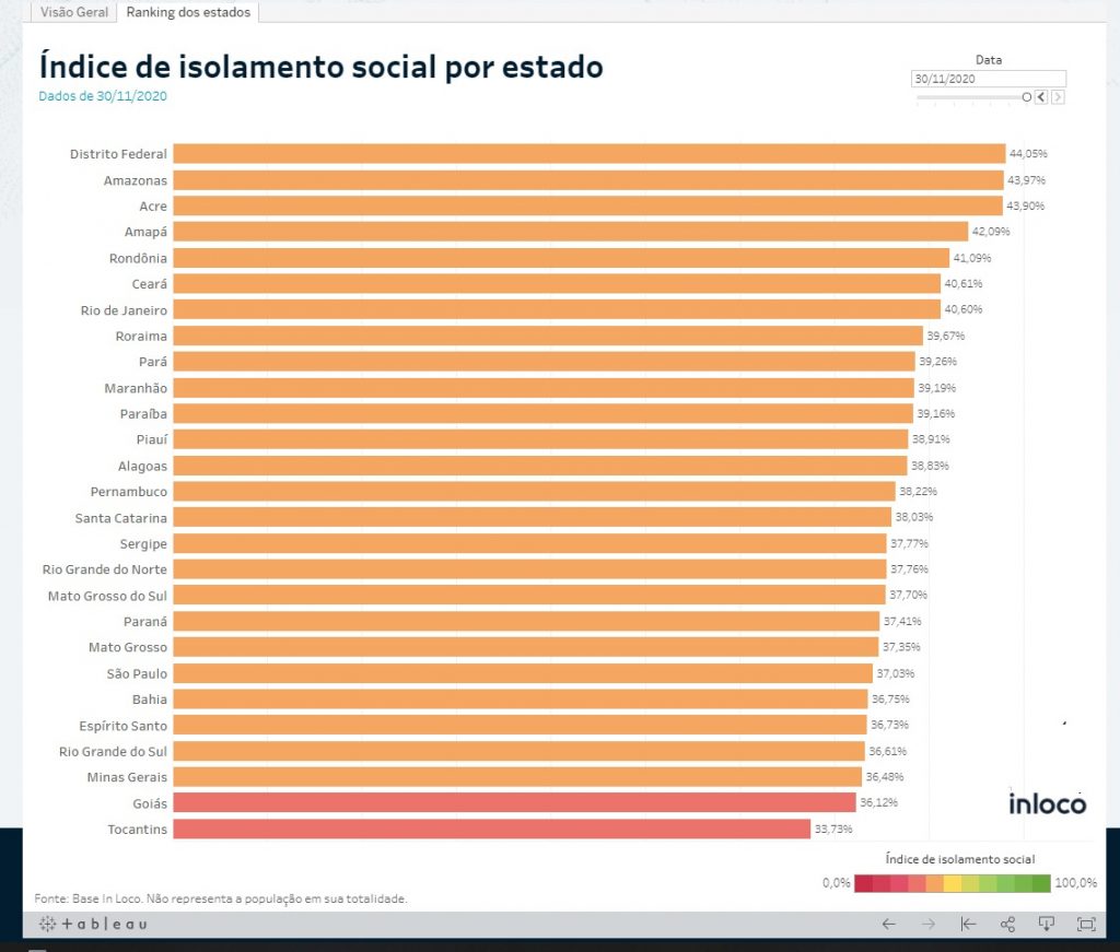 No dia 30, o Estado registrou um índice de isolamento social de 43,97%, perdendo apenas para o Distrito Federal, que ficou com 44,05%. Em novembro, o maior percentual no estado ocorreu no dia 22 (domingo): 51,1%. Tocantins foi a unidade federativa com o menor percentual no ranking brasileiro: 33,73%, também no dia 30.