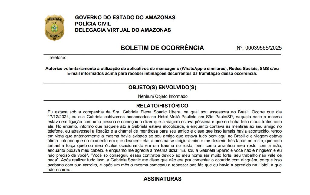 O boletim por agressão foi registrado no dia 7 de fevereiro de 2025, no 22º Distrito Integrado de Polícia (DIP), em Manaus (AM). A empresária relata, no documento, que a artista a acusou, por meio de uma ligação a uma terceira pessoa, de tê-la maltratado durante a viagem.