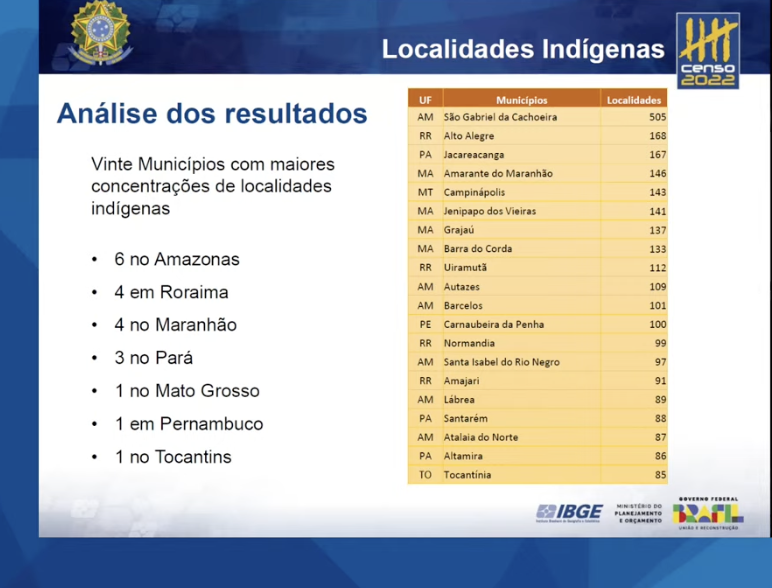 BRASÍLIA (DF) – Dos 20 municípios com o maior número de localidades indígenas no Brasil, 19 estão localizadas na Amazônia Legal, sendo seis no Amazonas, quatro em Roraima e no Maranhão, três no Pará e uma em Mato Grosso e Tocantins. É o que mostra o resultado do “Censo Demográfico 2022: Indígenas – Principais características das pessoas e dos domicílios”, divulgado pelo Instituto Brasileiro de Geografia e Estatística (IBGE), nesta quinta-feira, 19, no Rio de Janeiro.