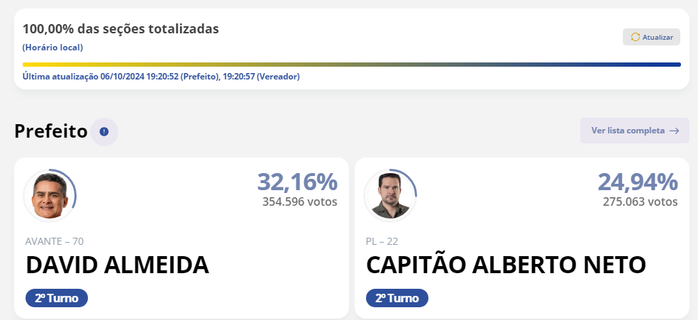 David Almeida (Avante) e o deputado federal Alberto Neto (PL) se enfrentarão no segundo turno, em Manaus, a maior cidade da Região Norte. Com 100% das urnas apuradas, Almeida obteve 354.596 votos, o que representa 32,16% dos votos válidos. Já o candidato apoiado pelo ex-presidente Jair Bolsonaro (PL) alcançou 275.063 votos (24,94%).