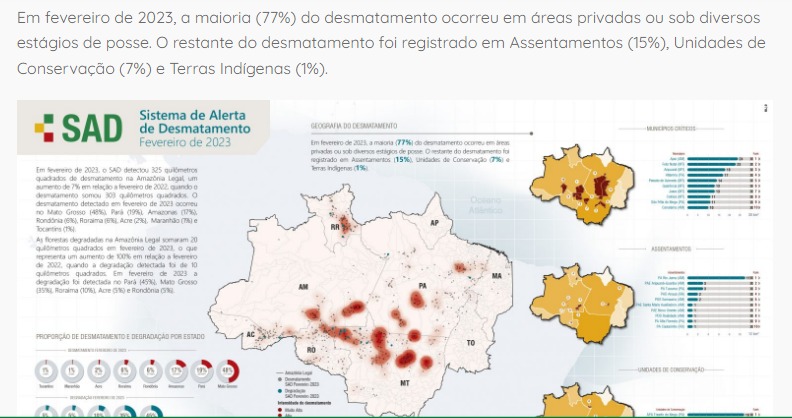 “Em fevereiro de 2023, a maioria (77%) do desmatamento ocorreu em áreas privadas ou sob diversos estágios de posse. O restante do desmatamento foi registrado em Assentamentos (15%), Unidades de Conservação (7%) e Terras Indígenas (1%)”, informa o monitoramento.