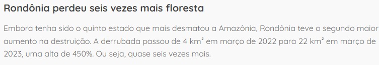 “Em março, oito dos nove Estados que compõem a Amazônia Legal apresentaram aumento no desmatamento, com exceção do Amapá. Com isso, 42% do desmatamento previsto pela plataforma PrevisIA, para o período de agosto de 2022 a junho de 2023, de 11.805km², já ocorreu“.