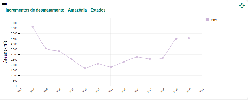 Conforme o relatório do Sistema de Detecção de Desmatamento em Tempo Real (Deter), a área desmatada em abril foi de 580 km². O Estado do Pará permanece liderando o ranking de desmate e vem apresentando um aumento significativo de área degradada. No balanço que contempla o período anual entre agosto de 2019 a abril de 2020, o Estado apresenta uma área de 4.532,14 km² com incrementos de desmatamento, é o maior índice desde de 2008 quando verificou-se 5.636,55 km².