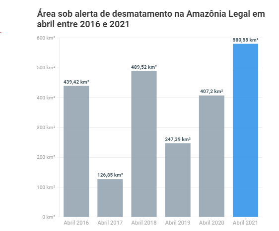 Em fevereiro, o Estado apresentou uma área de 27,12km² com avisos de desmatamento, enquanto em março e abril subiu para 81,89km² e 117,34km², respectivamente.