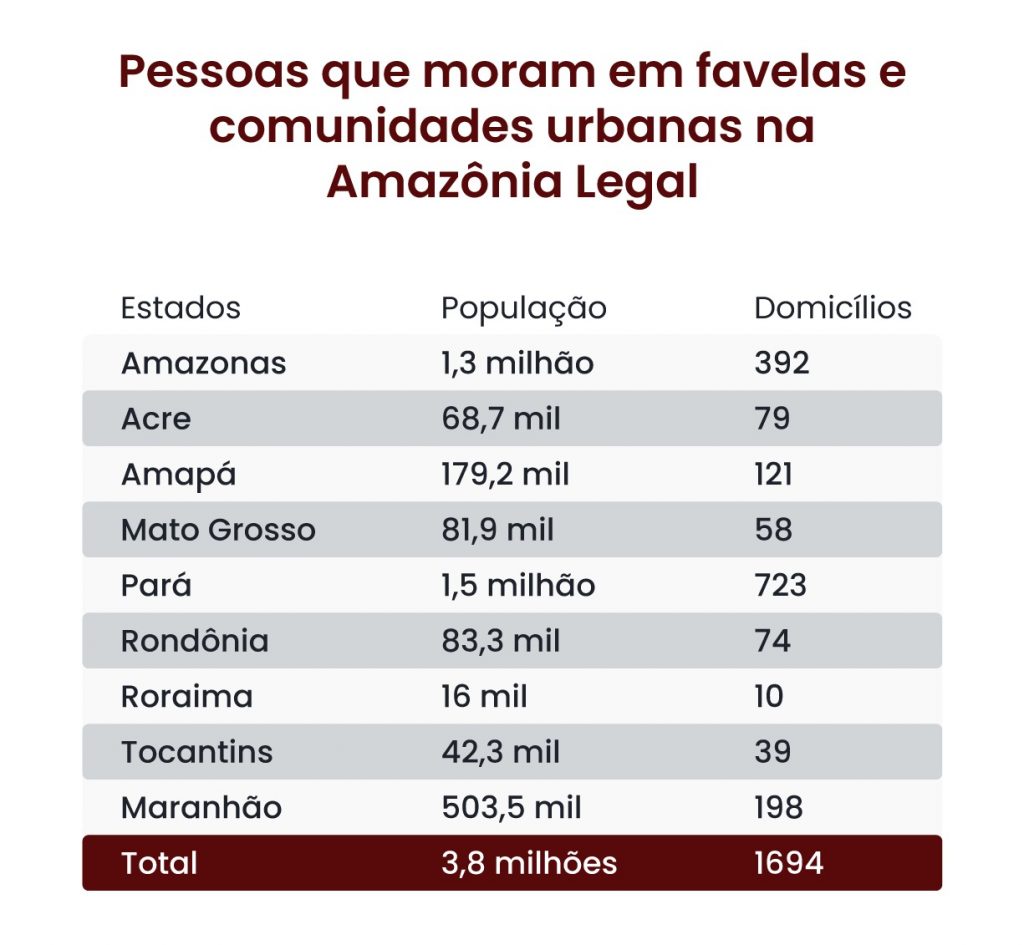 Isso reflete no tamanho da população. Manaus concentra 1,151 milhão de pessoas vivendo nesse tipo de organização urbana, enquanto, em Belém, são 745,140 habitantes. Na capital do Amapá, são 127,6 mil moradores de favelas e comunidades urbanas. Porto Velho (RO) reúne 79.809, Cuiabá (MT), 72.415 habitantes, Palmas tem 29.944 residentes nesses espaços e Boa Vista (RR), 16.016 pessoas. Em São Luís (MA), são 358.818 moradores.