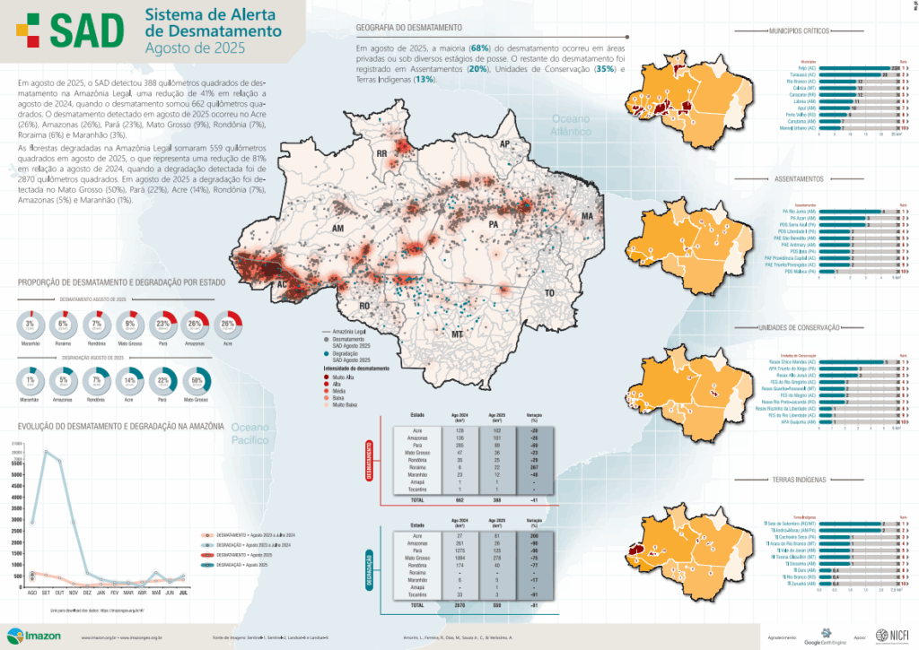 Em relação à degradação florestal, causada por queimadas e extração de madeira, agosto de 2025 registrou 559 km², uma queda de 81% em comparação aos 2.870 km² de agosto de 2024. Ainda assim, essa área corresponde à perda de 1,8 mil campos de futebol por dia e está entre as maiores da série histórica.