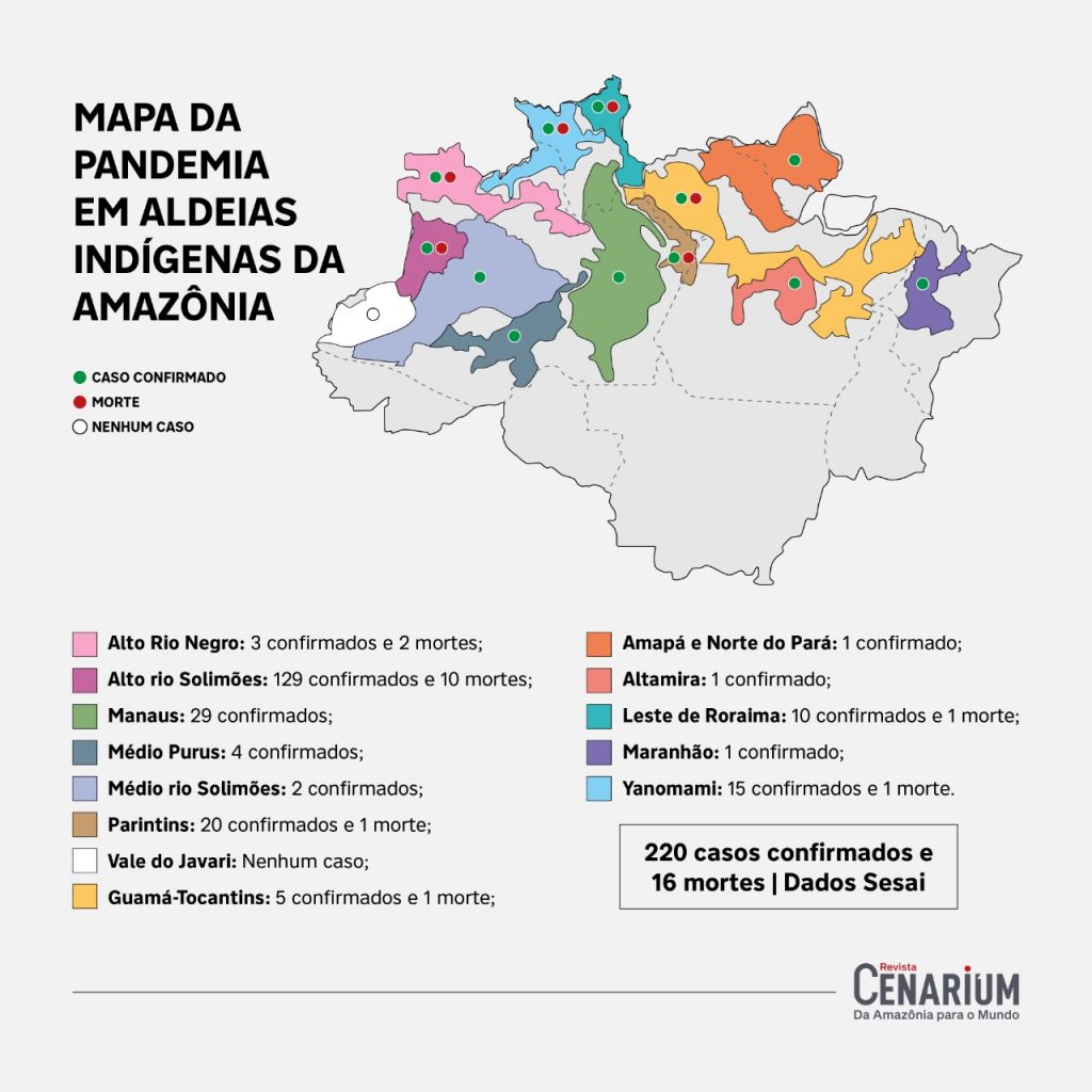 No Amazonas, a pandemia já atingiu seis, das sete unidades da Dsei, segundo dados da Sesai, totalizando 187 casos confirmados e 13 mortes: Alto Rio Negro (3 confirmados e 2 mortes); Alto rio Solimões (129 confirmados e 10 mortes); Manaus (29 confirmados); Médio Purus (4 confirmados); Médio rio Solimões (2 confirmados) ; Parintins (20 confirmados e 1 óbito). No Vale do Javari não foi confirmado nenhum caso e nenhuma morte.