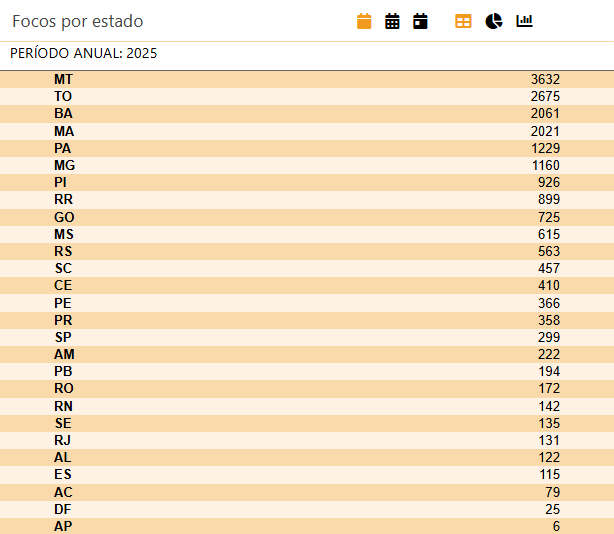 Mesmo com o Mato Grosso e Tocantins liderando o ranking, juntos, com 6,3 mil focos de queimadas em 2025, os Estados da Amazônia garantiram a segunda colocação na diminuição dos focos de calor, com o Amapá liderando a lista com apenas seis pontos de calor registrados neste ano e o Acre com 79.