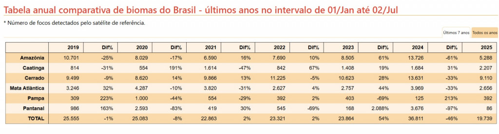 O Brasil, como um todo, saiu de 3,1 milhões de hectares queimados no primeiro semestre de 2024 para cerca de 1 milhão de hectares nos primeiros seis meses de 2025, representando uma queda de 65,8% nas áreas afetadas pelo fogo.