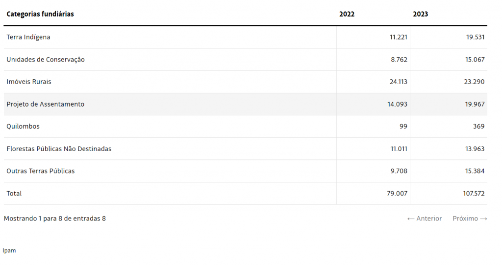 Por outro lado, florestas nativas na região mais ao norte do Pará, em Roraima e no Amapá foram muito atingidas. A área queimada aumentou em terras indígenas, unidades de conservação, projetos de assentamento, quilombos, florestas públicas não destinadas e outros tipos de terras públicas.