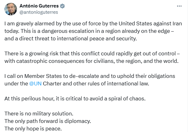 Guterres também pediu que os países cumpram a carta da ONU para reduzir a tensão na região e defendeu a diplomacia para o caminho da paz. De acordo com a autoridade, há riscos da situação sair de controle e citou “consequências catastróficas para o mundo”. “Não há solução militar. O único caminho a seguir é a diplomacia”, escreveu. Veja post:
