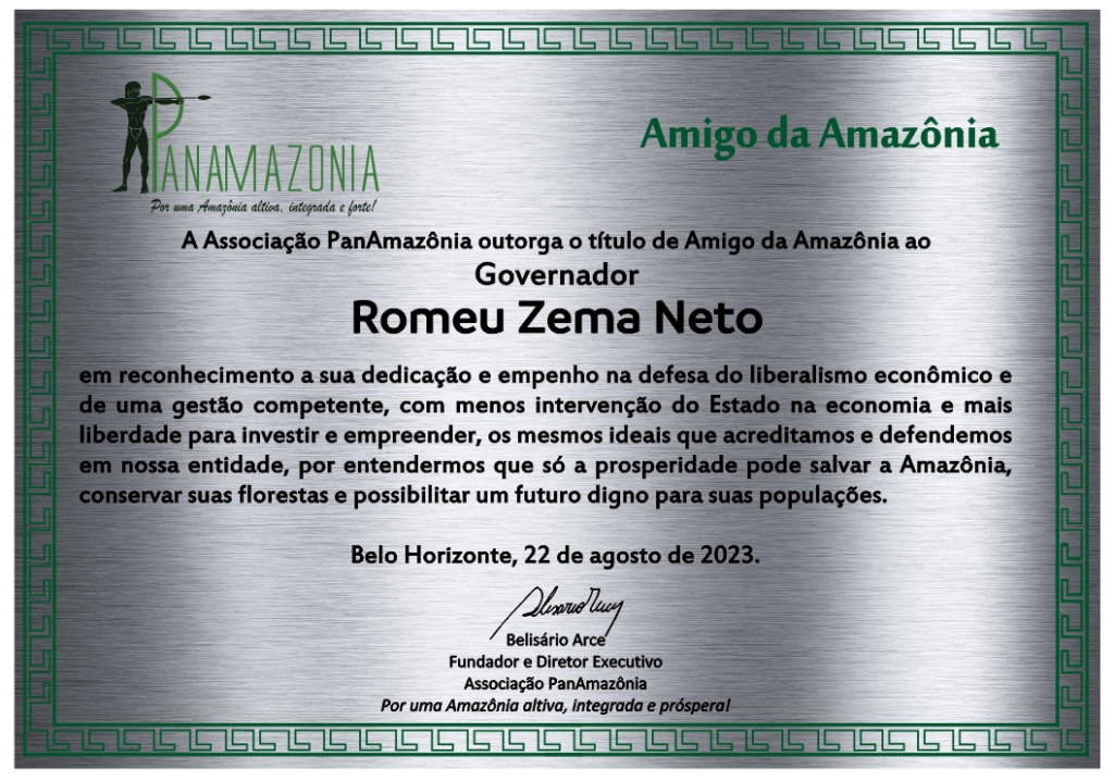 “Em reconhecimento a sua dedicação e empenho na defesa do liberalismo econômico e de uma gestão competente, com menos intervenção do governo na economia e mais liberdade para investir e empreender, os mesmos ideais que acreditamos e defendemos em nossa entidade, por entendermos que só a prosperidade pode salvar a Amazônia, conservar suas florestas e possibilitar um futuro digno para suas populações”, diz a placa entregue pelos empresários Bertolini e Arce.