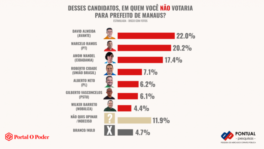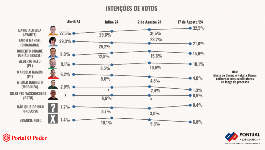 Quem encabeça o ranking é o prefeito David Almeida. Em abril, o chefe do Executivo municipal concentrou 27,5% das intenções de votos. Em abril, esse número foi 29,8% e, no início de agosto, foi 31,5%. Agora, atingiu 32,5%.