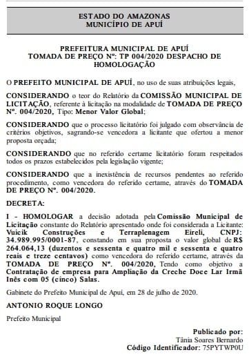 O documento assinado pelo prefeito Antônio Roque (DEM), informa que a decisão foi adotada pela Comissão Municipal de Licitação, cuja vencedora da licitação, foi a empresa Vuicik Construções e Terraplanagem Eireli, por meio da tomada de preços nº 004/2020.