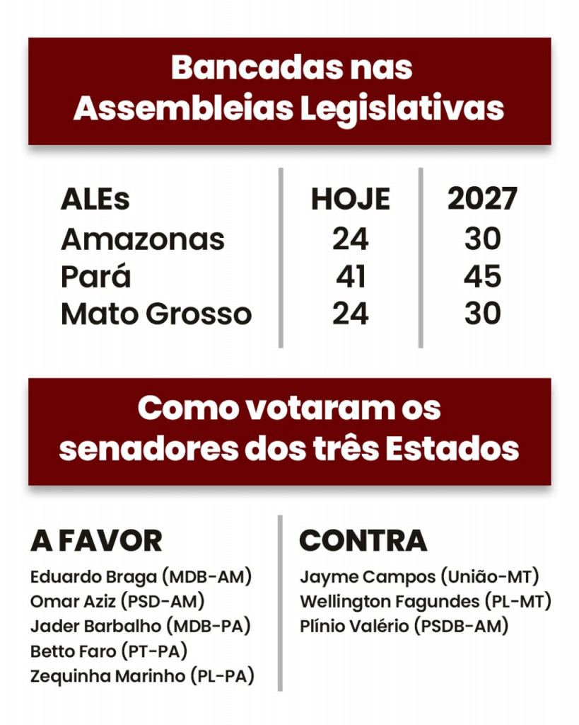 BRASÍLIA (DF) – O efeito cascata da ampliação de vagas na Câmara dos Deputados, aprovada na noite dessa quarta-feira, 25, pelo Senado, elevará em 16 deputados estaduais nas Assembleias Legislativas dos Estados (ALEs) do Amazonas, Pará e Mato Grosso, que integram a Amazônia Legal, seis a mais para os dois primeiros e quatro para o legislativo paraense. Os parlamentares aprovaram a elevação de 18 vagas, o que amplia de 513 para 531 deputados federais, a partir de 2027.