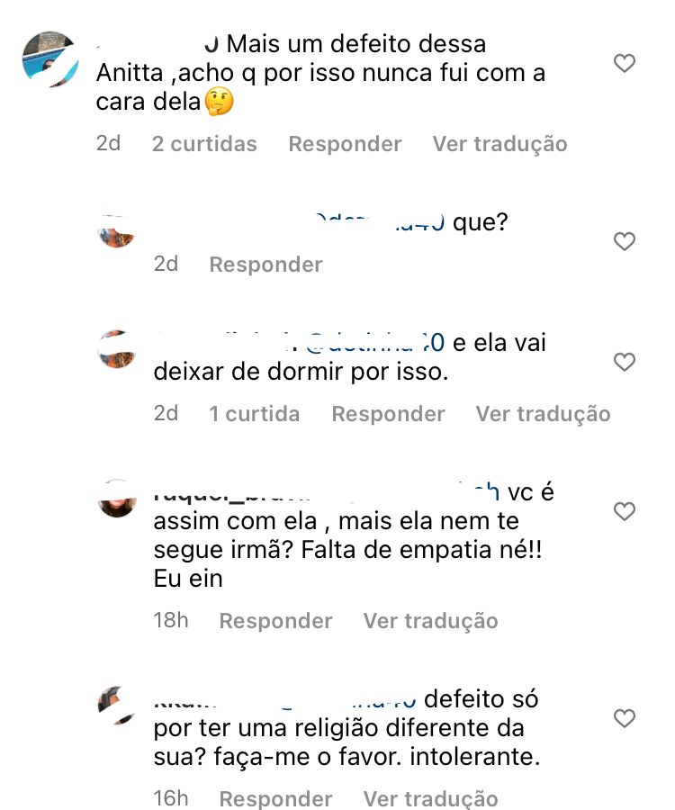 Em outro comentário, um homem relaciona a religião de Anitta a um “defeito”. “Mais um defeito dessa Anitta, acho que por isso nunca fui com a cara dela”, disse o internauta na publicação do pai de santo Sergio Pina.
