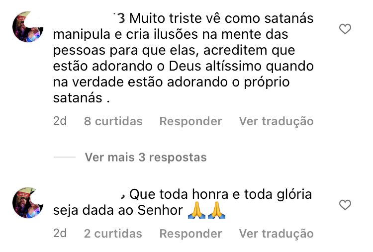 Nos comentários da publicação, notas maldosas sobre a cantora foram registradas pela reportagem. Em uma delas, uma pessoa escreve: “Muito triste vê como satanás manipula e cria ilusões na mente das pessoas para que elas acreditem que estão adorando o Deus altíssimo quando, na verdade, estão adorando o próprio satanás”.