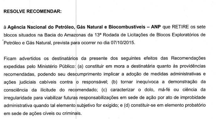 Após o leilão, o MPF pediu explicações da ANP, nesta terça-feira, 12, para que a agência se manifeste sobre a manutenção dos blocos exploratórios da Bacia do Amazonas no processo, mesmo diante de uma recomendação que pede a exclusão, desde 2015. O MPF solicitou manifestação em cinco dias.