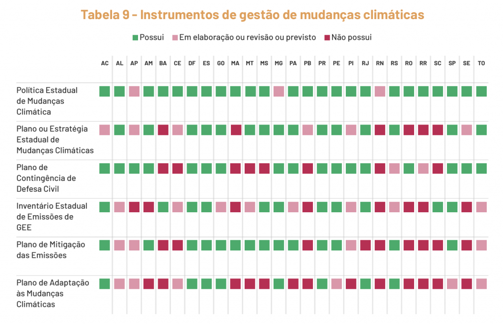 A pior situação é a do Estado do Rio Grande do Norte, que ainda está em fase de elaboração do seu Plano Estadual de Mudança Climática e não possui nenhum dos outros instrumentos.