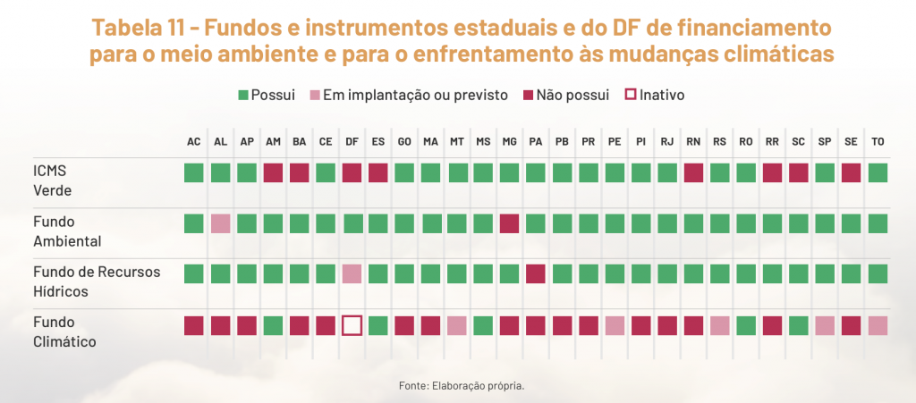 O levantamento também quis saber a situação das unidades da federação em relação aos fundos ambientais, climáticos e de recursos hídricos nos Estados e Imposto Sobre Circulação de Mercadorias e Serviços, o ICMS Verde. Apenas Mato Grosso do Sul e Rondônia possuem os quatro apresentados.