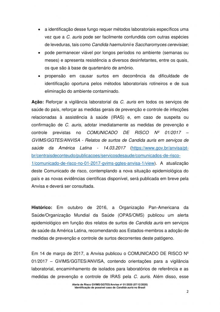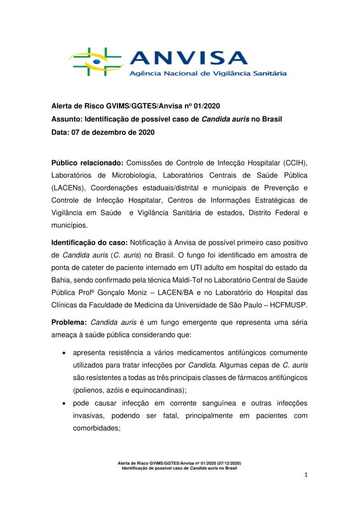 A Anvisa informou ainda que o Candida auris (C. auris) “é um fungo emergente que representa uma séria ameaça à saúde pública”. A infecção por C. auris é resistente a medicamentos e pode ser fatal. Em todo o mundo, estima-se que infecções fúngicas invasivas de C. auris tenham levado à morte de entre 30% e 60% dos pacientes.