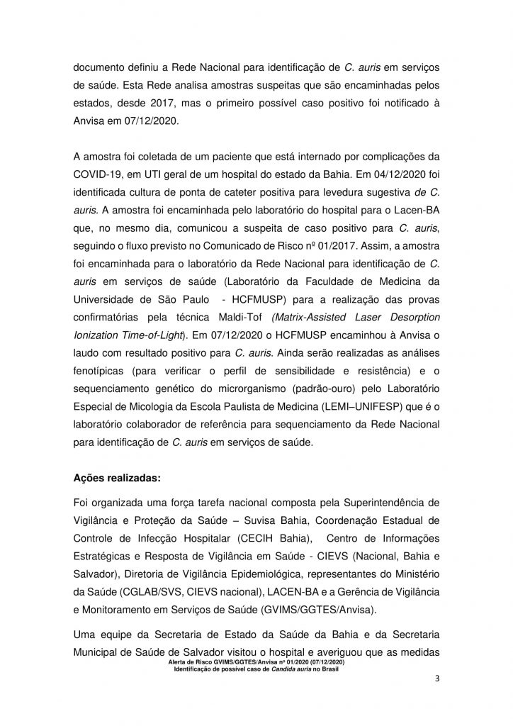 “O fungo foi identificado em amostra de ponta de cateter de paciente internado em UTI adulto em hospital do estado da Bahia, sendo confirmado pela técnica Maldi-Tof no Laboratório Central de Saúde Pública Profº Gonçalo Moniz – LACEN/BA e no Laboratório do Hospital das Clínicas da Faculdade de Medicina da Universidade de São Paulo – HCFMUSP”, diz trecho da notificação.