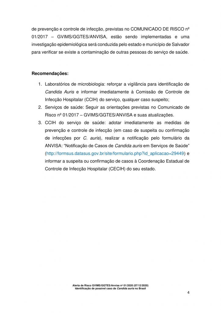 A Anvisa ainda recomendou aos serviços de saúde, para seguir as orientações previstas no Comunicado de Risco nº 01/2017 – GVIMS/GGTES/Anvisa e suas atualizações e ao CCIH do serviço de saúde, para adotar imediatamente as medidas de prevenção e controle de infecção (em caso de suspeita ou confirmação de infecções por C. auris), realizar a notificação pelo formulário da Anvisa: “Notificação de Casos de Candida auris em Serviços de Saúde” e informar a suspeita ou confirmação de casos à Coordenação Estadual de Controle de Infecção Hospitalar (CECIH) do seu estado.