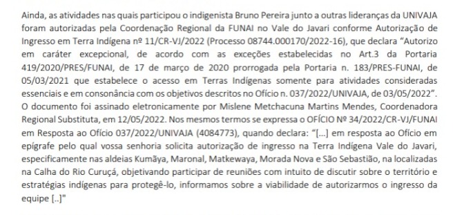 Porém, o documento disponibilizado pela Equipe de Vigilância da Univaja (EVU) diz que todos os protocolos da Funai foram cumpridos e a autorização para Bruno foi assinada, eletronicamente, pela coordenadora regional substituta, Mislene Metchacuna, em 12 de maio.