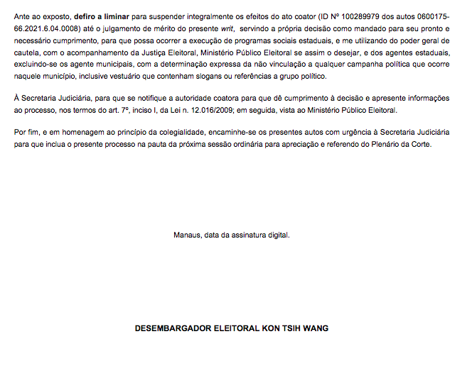 “Defiro a liminar para suspender integralmente (…) para que possa ocorrer a execução de programas sociais estaduais, e me utilizando do poder geral de cautela, com o acompanhamento da Justiça Eleitoral, Ministério Público Eleitoral, se assim o desejar, e dos agentes estaduais, excluindo-se os agentes municipais, com a determinação expressa da não vinculação a qualquer campanha política que ocorre naquele município, inclusive vestuário que contenha slogans ou referências a grupo político”, explicou o desembargador na decisão judicial.