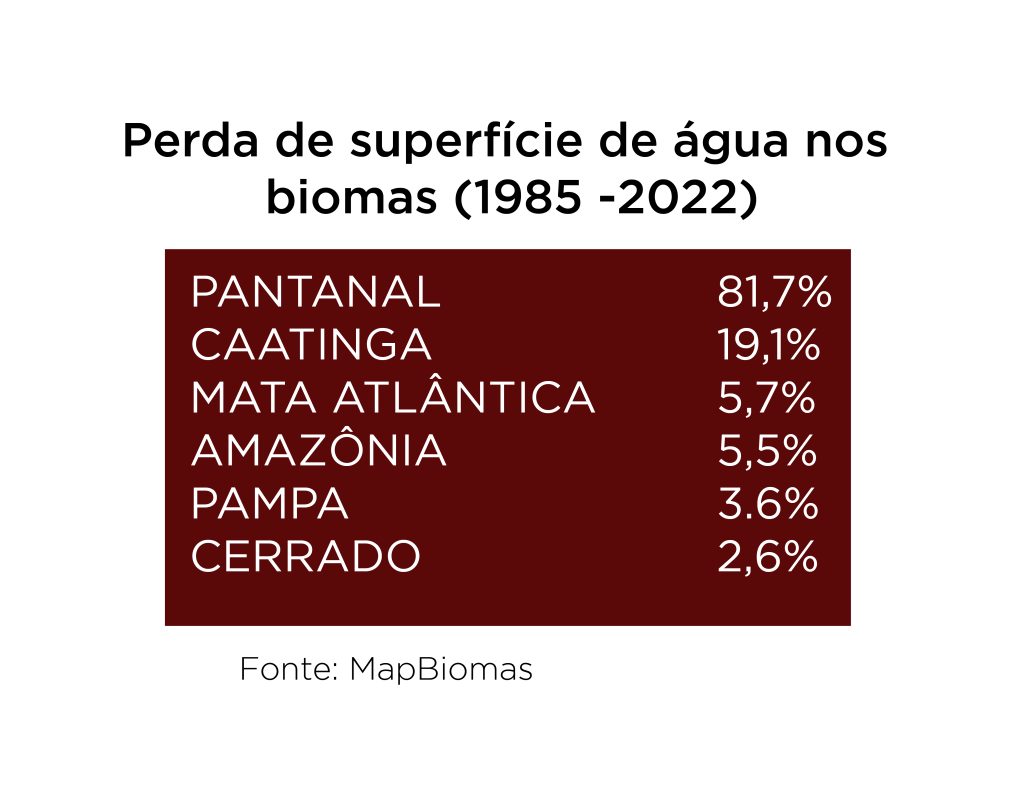 Segundo o estudo, todos os biomas brasileiros perderam água entre 1985 e 2022. A situação mais crítica é a do Pantanal, que teve queda de 81,7% nesses 37 anos. Depois, vem a Caatinga, com perda de 19,1%, ou seja, um quinto de sua superfície de água. Em terceiro, a Mata Atlântica, com queda de 5,7%, seguida da Amazônia, com 5,5%, do Pampa, 3,6%, e do Cerrado, 2,6%.