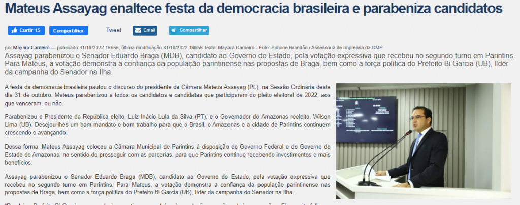 Em outubro de 2022, após o segundo turno das eleições gerais, Assayag foi à tribuna da Câmara Municipal de Parintins expressar felicitações ao senador pela votação expressiva recebida na cidade. Naquele ano, Braga disputou o governo do Amazonas e perdeu a eleição para Wilson Lima (União Brasil). A declaração consta em registros da assessoria do parlamentar no site da Casa Legislativa da cidade.