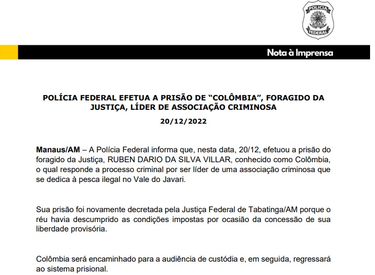 “A Polícia Federal informa que, nesta terça-feira, 20/12, efetuou a prisão do foragido da Justiça, conhecido como ‘Colômbia’, o qual responde a processo criminal por ser líder de uma associação criminosa que se dedica à pesca ilegal no Vale do Javari. Sua prisão foi novamente decretada pela Justiça Federal de Tabatinga/AM porque o réu havia descumprido as condições impostas por ocasião da concessão de sua liberdade provisória“, informa a PF.