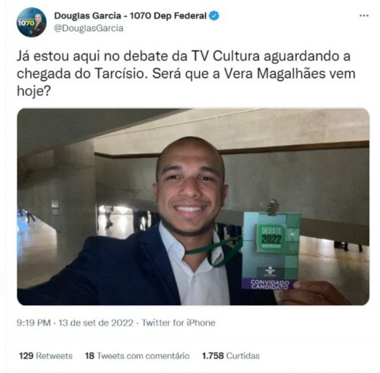 “Terei de sair escoltada do Memorial da América Latina, por seguranças, porque fui agredida pelo deputado Douglas Garcia (…) Há centenas de testemunhas. Usou o convite no estafe do Tarcísio de Freitas, no debate, apenas para vir me acossar e ameaçar”, escreveu Vera em suas redes sociais.