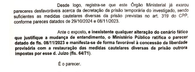 “Inexistente qualquer alteração do cenário fático que justifique a mudança de entendimento, o MPAM manifesta-se de forma favorável à concessão da liberdade provisória com a restauração das medidas cautelares diversas da prisão impostas por este Juízo”, diz trecho do parecer. Veja: