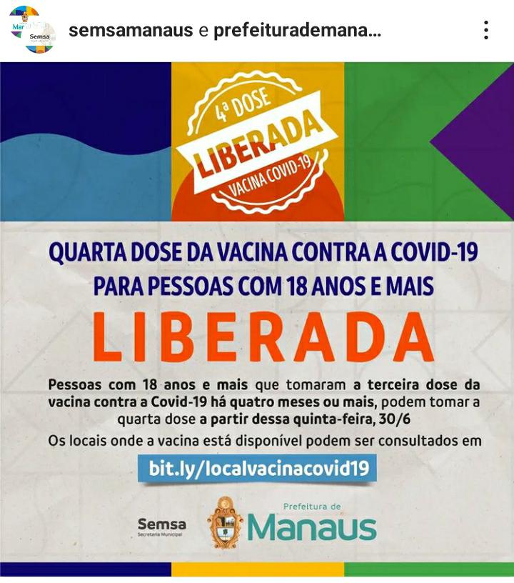 Os locais com horários e as vacinas disponíveis podem ser consultados no site da Semsa e também nas redes sociais da secretaria (@semsamanaus no Instagram e Semsa Manaus no Facebook). Em todas as Unidades Básicas de Saúde (UBSs) são ofertadas a primeira, segunda, terceira e quarta doses da vacina.