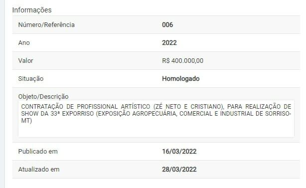Parte do evento Exporriso, tradicional feira agropecuária, comercial e industrial de Sorriso, o show foi bancado pela Secretaria de Desenvolvimento Econômico do município, por meio de um contrato com inexigibilidade de licitação. Em português claro, não houve concorrência para a definição de valores pelo serviço prestado.