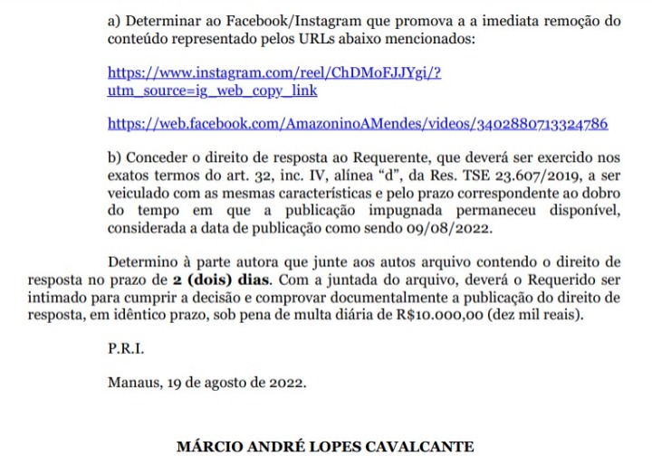 A medida atende ao pedido da defesa do governador, acatada em 19 de agosto deste ano, em que o magistrado determina, ainda, a exclusão de uma publicação com notícia falsa, compartilhada no Facebook e Instagram, do candidato Amazonino alegando que Wilson Lima estaria aguardando a proximidade das eleições para pagar o abono de R$ 97 milhões, quando já poderia ter feito isso desde julho. O valor, contudo, não consta nos cofres públicos do Estado.