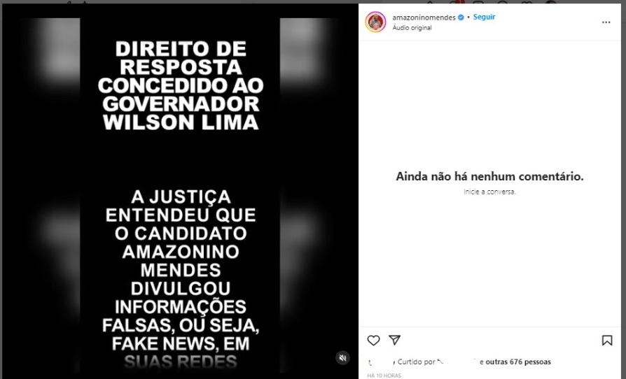 “A Justiça entendeu que o candidato Amazonino divulgou informações falsas nas redes sociais a respeito do trabalho do governador Wilson Lima. Em vídeo divulgado sobre o Fundeb, Amazonino fez acusações levianas na tentativa de colocar os usuários da internet contra o atual governador do Estado. A verdade sobre o Fundef é uma só: o recurso ainda não foi liberado, por questões que não dependem do Estado, comprovadas documentalmente”, diz trecho do direito de resposta.
